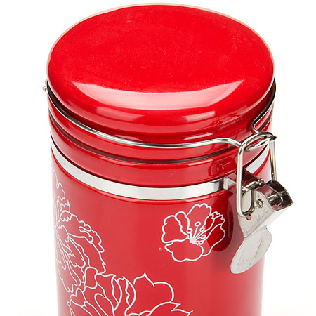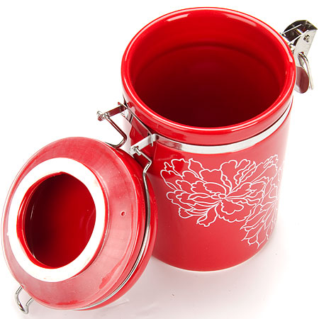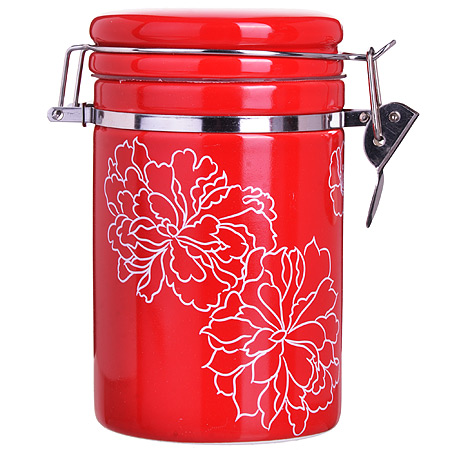 Банка для сыпучих продуктов (герметичный контейнер) LORAINE изготовлена из прочной БИО и ЭКО доломитовой керамики красного цвета с белыми цветами. Банка прекрасно подойдет для хранения различных сыпучих продуктов: специй, чая, кофе, сахара, круп и многого другого. Крышка герметично закрывается с помощью металлического зажима-клипсы, дольше сохраняя свежесть продуктов. Гладкая и ровная поверхность обеспечивает легкую очистку. Такая банка не только сэкономит место на вашей кухне, но и украсит интерьер. Оригинальный дизайн и красивое оформление позволит сделать ее отличным подарком на любой праздник. Подходит для использования в холодильнике. Подходит для мытья в посудомоечной машине. Объем: 700 мл.