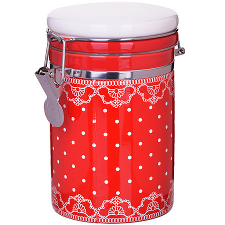 Банка для сыпучих продуктов (герметичный контейнер) LORAINE изготовлена из прочной БИО и ЭКО доломитовой керамики красного цвета с белым узором. Банка прекрасно подойдет для хранения различных сыпучих продуктов: специй, чая, кофе, сахара, круп и многого другого. Крышка герметично закрывается с помощью металлического зажима-клипсы, дольше сохраняя свежесть продуктов. Гладкая и ровная поверхность обеспечивает легкую очистку. Такая банка не только сэкономит место на вашей кухне, но и украсит интерьер. Оригинальный дизайн и красивое оформление позволит сделать ее отличным подарком на любой праздник. Подходит для использования в холодильнике. Подходит для мытья в посудомоечной машине. Объем: 700 мл.