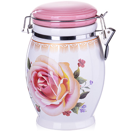 Банка для сыпучих продуктов LORAINE изготовлена из доломитовой керамики высокого качества и украшена красивым цветочным рисунком. Банка прекрасно подойдет для хранения различных сыпучих продуктов: специй, чая, кофе, сахара, круп и многого другого. Крышка плотно закрывается с помощью металлического зажима-клипсы, дольше сохраняя свежесть продуктов. Гладкая и ровная поверхность обеспечивает легкую очистку. Такая банка не только сэкономит место на вашей кухне, но и украсит интерьер. Оригинальный дизайн и красивое оформление позволит сделать ее отличным подарком на любой праздник. Подходит для мытья в посудомоечной машине. Объем: 930 мл.