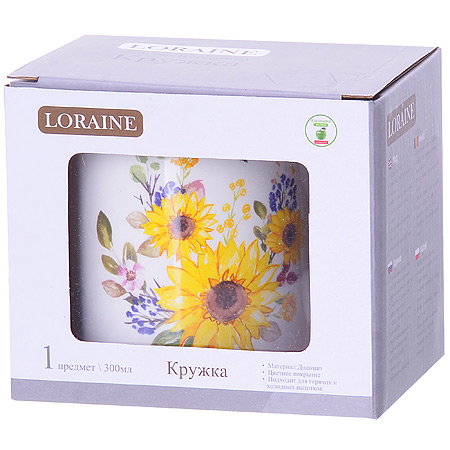 Чашка кружка 300мл LORAINE Подсолнух доломит LORAINE Чашки, кружки LR Кружка LORAINE изготовлена из доломитовой керамики высокого качества. Такая кружка неоспоримо является одним из самых эффектных подарков. Изящный дизайн придется по вкусу и ценителям классики, и тем, кто предпочитает утонченность и изысканность. Кружка настроит на позитивный лад и подарит хорошее настроение с самого утра, а чаепитие превратится в