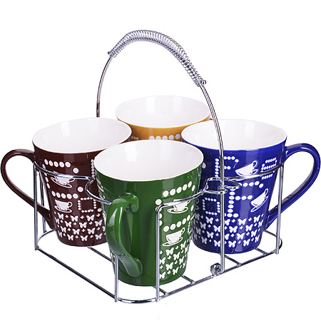 Набор из 4-х разноцветных кружек изготовлен из высококачественной керамики, украшен белым узором и стилизованной надписью "Coffee". Изящный дизайн придется по вкусу и ценителям классики, и тем, кто предпочитает современность. Он настроит на позитивный лад и подарит хорошее настроение с самого утра. Изделия можно компактно хранить на подставке, входящей в набор. Набор кружек — идеальный и необходимый подарок для вашего дома и для ваших друзей в праздники, юбилеи и торжества. Подходит для мытья посудомоечной машине. Объем: 340 мл.