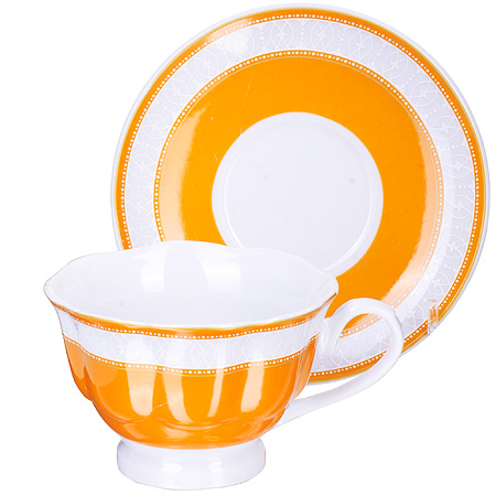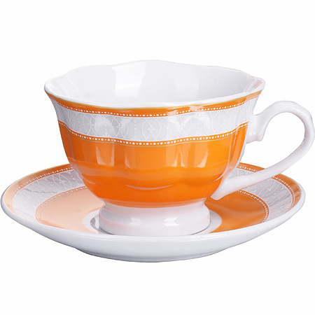 Чайная кофейная пара: чашка 220мл, блюдце 13,5см LORAINE Орнамент фарфор, оранжевая LORAINE Чашки, кружки LR Чайная пара LORAINE на 1 персону, изготовленная из высококачественного костяного фарфора изысканного белого цвета, состоит из чашки и блюдца. Изделия набора украшены тонкой каймой и имеют красивый и нежный дизайн. Набор придется по вкусу и ценителям классики, и тем, кто предпочитает утонченность и изысканность. Он настроит на позитивный лад и
