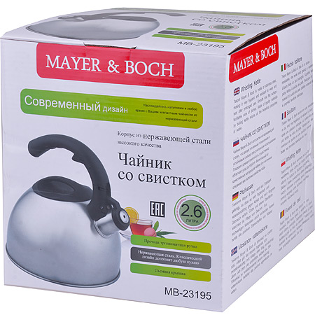 Чайник MAYER & BOCH изготовлен из высококачественной нержавеющей стали. Изделия из нержавеющей стали не окисляются и не впитывают запахи, благодаря чему вы всегда получите натуральный, насыщенный вкус и аромат напитков. Капсулированное дно с прослойкой из алюминия обеспечивает наилучшее распределение тепла. Удобная фиксированная ручка выполнена из бакелита, также на ручке расположена клавиша механизма открывания носика. Носик чайника оснащен насадкой-свистком, который позволяет контролировать процесс кипячения или подогрева воды. Поверхность чайника гладкая, что облегчает уход за ним. Эстетичный и функциональный, с современным дизайном, чайник будет оригинально смотреться на любой кухне. Подходит для использования на всех типах плит, кроме индукционных. Подходит для мытья в посудомоечной машине. Объем: 2500 мл.