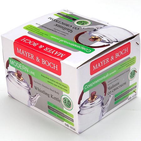 Чайник MAYER & BOCH изготовлен из высококачественной нержавеющей стали (CrNi 18/10). Изделия из нержавеющей стали не окисляются и не впитывают запахи, благодаря чему вы всегда получите натуральный, насыщенный вкус и аромат напитков. Капсулированное дно с прослойкой из алюминия обеспечивает наилучшее распределение тепла. Подвижная эргономичная ручка выполнена из нержавеющей стали и бакелита и удобно лежит в руке. Крышка чайника оснащена свистком, который позволяет контролировать процесс кипячения или подогрева воды. Поверхность чайника серебристая с зеркальным блеском. Эстетичный и функциональный, с классическим дизайном, чайник будет оригинально смотреться на любой кухне. Подходит для использования на всех типах плит, включая индукционные. Подходит для мытья в посудомоечной машине