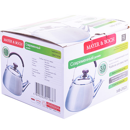 Чайник MAYER & BOCH изготовлен из высококачественной нержавеющей стали. Изделия из нержавеющей стали не окисляются и не впитывают запахи, благодаря чему вы всегда получите натуральный, насыщенный вкус и аромат напитков. Капсулированное дно с прослойкой из алюминия обеспечивает наилучшее распределение тепла. Подвижная эргономичная ручка выполнена из нержавеющей стали и бакелита и удобно лежит в руке. Крышка чайника оснащена свистком, который позволяет контролировать процесс кипячения или подогрева воды. Поверхность чайника серебристая с зеркальным блеском. Эстетичный и функциональный, с классическим дизайном, чайник будет оригинально смотреться на любой кухне. Подходит для использования на всех типах плит, включая индукционные. Подходит для мытья в посудомоечной машине Объем: 3000 мл.