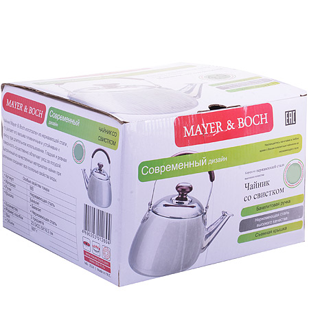 Чайник MAYER & BOCH изготовлен из высококачественной нержавеющей стали (CrNi 18/10). Изделия из нержавеющей стали не окисляются и не впитывают запахи, благодаря чему вы всегда получите натуральный, насыщенный вкус и аромат напитков. Поверхность чайника гладкая, что облегчает уход за ним. Эстетичный и функциональный, с современным дизайном, чайник будет замечательно смотреться на любой кухне. Подходит для использования на всех типах плит, кроме индукционных. Подходит для мытья в посудомоечной машине. Объем: 5000 мл.