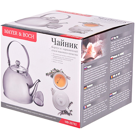 Заварочный чайник MAYER & BOCH с металлическим фильтром/ситечком. Изготовлен из высококачественной нержавеющей стали. Изделия из нержавеющей стали не окисляются и не впитывают запахи, благодаря чему вы всегда получите натуральный, насыщенный вкус и аромат напитков. Сетчатый металлический фильтр гарантирует прозрачность и чистоту напитка от чайных листьев, при этом сохранив букет и насыщенность чая. Эргономичная ручка не нагревается, что делает использование чайника очень удобным и безопасным. Эстетичный и функциональный чайник MAYER & BOCH будет прекрасно смотреться в любом интерьере. Подходит для использования на всех видах плит, в том числе индукционных. Подходит для мытья в посудомоечной машине.