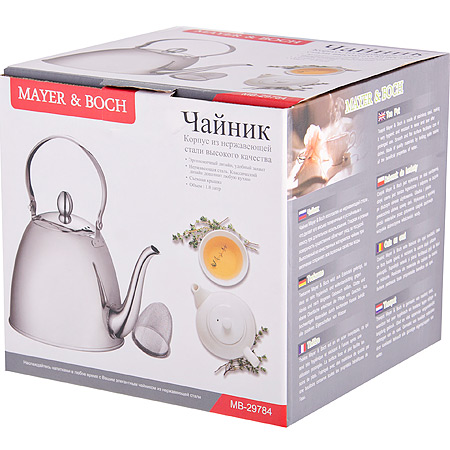 Заварочный чайник MAYER & BOCH с металлическим фильтром/ситечком. Изготовлен из высококачественной нержавеющей стали. Изделия из нержавеющей стали не окисляются и не впитывают запахи, благодаря чему вы всегда получите натуральный, насыщенный вкус и аромат напитков. Сетчатый металлический фильтр гарантирует прозрачность и чистоту напитка от чайных листьев, при этом сохранив букет и насыщенность чая. Эргономичная ручка не нагревается, что делает использование чайника очень удобным и безопасным. Эстетичный и функциональный чайник MAYER & BOCH будет прекрасно смотреться в любом интерьере. Подходит для использования на всех видах плит, в том числе индукционных. Подходит для мытья в посудомоечной машине.