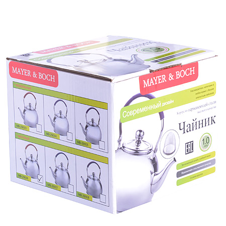 Заварочный чайник MAYER & BOCH с металлическим фильтром/ситечком. Изготовлен из высококачественной нержавеющей стали с матовой полировкой. Изделия из нержавеющей стали не окисляются и не впитывают запахи, благодаря чему вы всегда получите натуральный, насыщенный вкус и аромат напитков. Сетчатый металлический фильтр гарантирует прозрачность и чистоту напитка от чайных листьев, при этом сохранив букет и насыщенность чая. Эргономичная ручка из силикона не нагревается, что делает использование чайника очень удобным и безопасным. Эстетичный и функциональный чайник MAYER & BOCH будет прекрасно смотреться в любом интерьере. Подходит для использования на всех видах плит, в том числе индукционных. Подходит для мытья в посудомоечной машине.