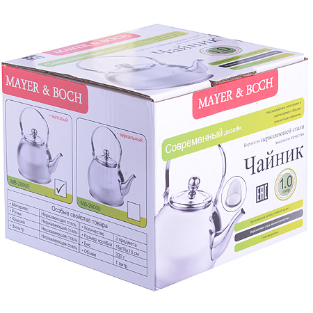 Чайник заварочный 1л MAYER & BOCH матовая нержавеющая сталь с ситечком MAYER & BOCH Чайники заварочные M&B Заварочный чайник MAYER & BOCH с металлическим фильтром/ситечком. Изготовлен из высококачественной нержавеющей стали с матовой полировкой. Изделия из нержавеющей стали не окисляются и не впитывают запахи, благодаря чему вы всегда получите натуральный, насыщенный вкус и аромат напитков. Сетчатый металлический фильтр гарантирует прозрачность и