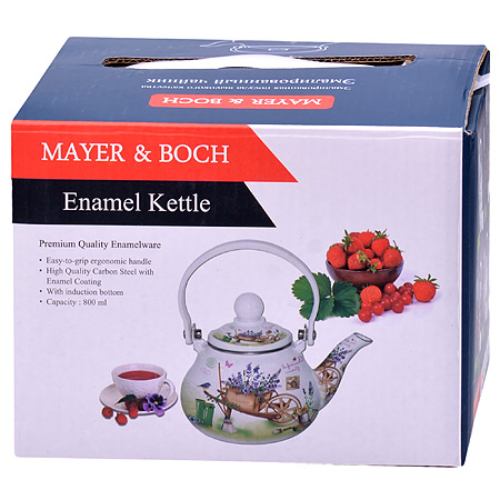 Чайник заварочный эмалированный 800мл MAYER & BOCH с ситечком MAYER & BOCH Чайники заварочные M&B Заварочный эмалированный чайник MAYER & BOCH с металлическим фильтром изготовлен из высококачественной углеродистой стали. Углеродистая сталь устойчива к высоким температурам и не теряет своих свойств при нагреве до 450°С. Углеродистая сталь быстро и равномерно нагревается и хорошо сохраняет тепло, легкая, прочная и долговечная. Сетчатый