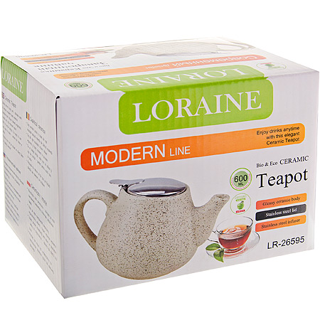Чайник заварочный керамический 600мл LORAINE бежевый LORAINE Чайники заварочные LR Заварочный чайник выполнен из высококачественной цветной керамики. Фильтр из нержавеющей стали для заваривания раскроет букет чая и не позволит чаинкам попасть в чашку. Удобная металлическая крышка поддержит нужную температуру для заваривания чая. Керамический чайник прост и удобен в применении, чайник легко мыть. Не ставьте чайник на открытый