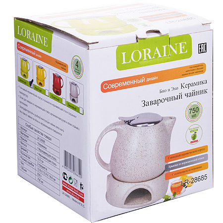 Заварочный чайник LORAINE изготовлен из керамики. Чайник оснащен керамической подставкой для подогрева, рассчитанной на одну греющую свечу. Изделия из керамики не впитывают запахи, благодаря чему Вы всегда получите натуральный, насыщенный вкус и аромат напитков. Заварочный чайник удобно использовать для повседневного заваривания чая практически любого сорта, но цветочные, фруктовые, красные и желтые сорта чая лучше других раскрывают свой вкус и аромат при заваривании именно в чайниках, а также сохраняют все полезные ферменты и витамины, содержащиеся в чайных листах. Фильтр гарантирует прозрачность и чистоту напитка от чайных листьев, при этом сохранив букет и насыщенность чая. Изящный заварочный чайник LORAINE будет прекрасно смотреться в любом интерьере. Не подходит для использования в микроволновой печи. Подходит для мытья в посудомоечной машине.
