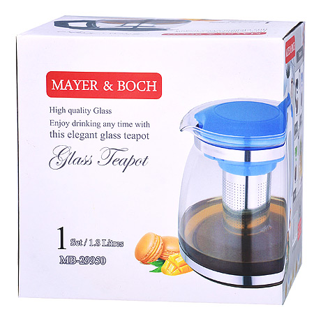 Заварочный чайник MAYER & BOCH изготовлен из термостойкого стекла, фильтр выполнен из нержавеющей стали. Изделия из стекла не впитывают запахи, благодаря чему вы всегда получите натуральный, насыщенный вкус и аромат напитков. Заварочный чайник из стекла удобно использовать для повседневного заваривания чая практически любого сорта. Но цветочные, фруктовые, красные и желтые сорта чая лучше других раскрывают свой вкус и аромат при заваривании именно в стеклянных чайниках, а также сохраняют все полезные ферменты и витамины, содержащиеся в чайных листах. Стальной фильтр гарантирует прозрачность и чистоту напитка от чайных листьев, при этом сохранив букет и насыщенность чая. Прозрачные стенки чайника дают возможность насладиться насыщенным цветом заваренного чая. Изящный заварочный чайник MAYER & BOCH будет прекрасно смотреться в любом интерьере.  Объем: 1,8 л.