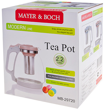 Заварочный чайник MAYER & BOCH изготовлен из термостойкого стекла, фильтр выполнен из нержавеющей стали. Изделия из стекла не впитывают запахи, благодаря чему вы всегда получите натуральный, насыщенный вкус и аромат напитков. Заварочный чайник из стекла удобно использовать для повседневного заваривания чая практически любого сорта. Но цветочные, фруктовые, красные и желтые сорта чая лучше других раскрывают свой вкус и аромат при заваривании именно в стеклянных чайниках, а также сохраняют все полезные ферменты и витамины, содержащиеся в чайных листах. Стальной фильтр гарантирует прозрачность и чистоту напитка от чайных листьев, при этом сохранив букет и насыщенность чая. Прозрачные стенки чайника дают возможность насладиться насыщенным цветом заваренного чая. Изящный заварочный чайник MAYER & BOCH будет прекрасно смотреться в любом интерьере. Подходит для мытья в посудомоечной машине. Объем: 2,2 л.