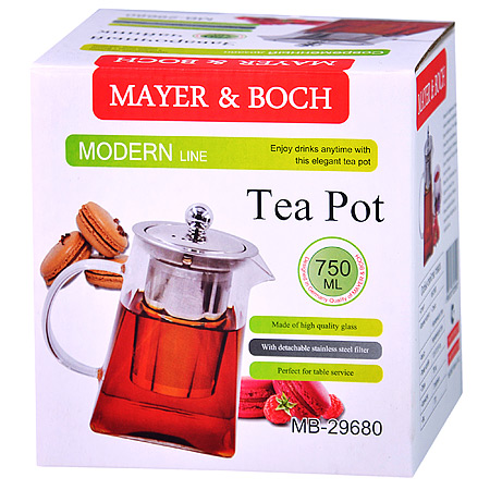 Заварочный чайник MAYER & BOCH изготовлен из термостойкого боросиликатного стекла, фильтр выполнен из нержавеющей стали. Изделия из стекла не впитывают запахи, благодаря чему вы всегда получите натуральный, насыщенный вкус и аромат напитков. Заварочный чайник из стекла удобно использовать для повседневного заваривания чая практически любого сорта. Но цветочные, фруктовые, красные и желтые сорта чая лучше других раскрывают свой вкус и аромат при заваривании именно в стеклянных чайниках, а также сохраняют все полезные ферменты и витамины, содержащиеся в чайных листах. Стальной фильтр гарантирует прозрачность и чистоту напитка от чайных листьев, при этом сохранив букет и насыщенность чая. Прозрачные стенки чайника дают возможность насладиться насыщенным цветом заваренного чая. Изящный заварочный чайник MAYER & BOCH будет прекрасно смотреться в любом интерьере. Подходит для мытья в посудомоечной машине.  Объем: 750 мл.