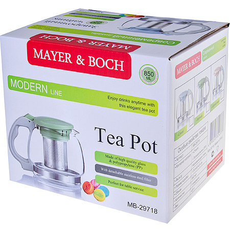 Заварочный чайник MAYER & BOCH изготовлен из термостойкого стекла, фильтр выполнен из нержавеющей стали. Изделия из стекла не впитывают запахи, благодаря чему вы всегда получите натуральный, насыщенный вкус и аромат напитков. Заварочный чайник из стекла удобно использовать для повседневного заваривания чая практически любого сорта. Но цветочные, фруктовые, красные и желтые сорта чая лучше других раскрывают свой вкус и аромат при заваривании именно в стеклянных чайниках, а также сохраняют все полезные ферменты и витамины, содержащиеся в чайных листах. Стальной фильтр гарантирует прозрачность и чистоту напитка от чайных листьев, при этом сохранив букет и насыщенность чая. Прозрачные стенки чайника дают возможность насладиться насыщенным цветом заваренного чая. Изящный заварочный чайник MAYER & BOCH будет прекрасно смотреться в любом интерьере. Подходит для мытья в посудомоечной машине. Объем: 850 мл.