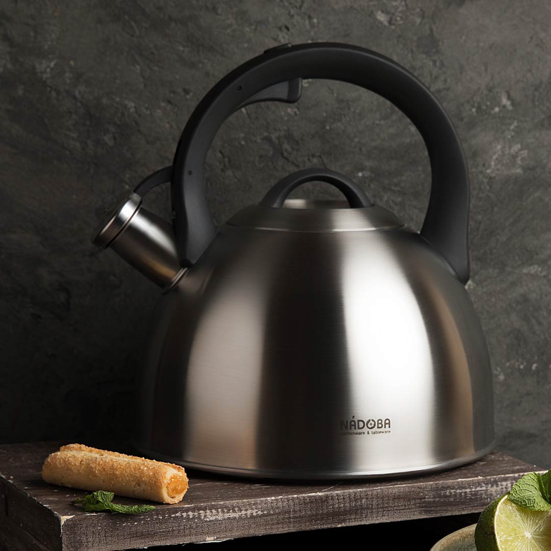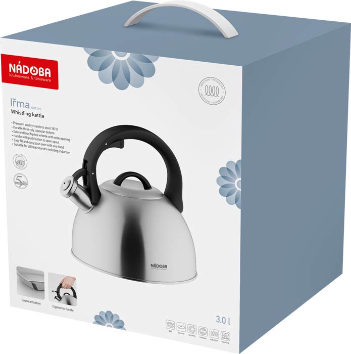 Высококачественная нержавеющая сталь 18/10. Трехслойное капсульное дно. Безопасный, громкий, широко открывающийся свисток. Эргономичная ненагревающаяся ручка с кнопкой для открывания носика. Подходит для всех типов плит. Гарантия 5 лет.