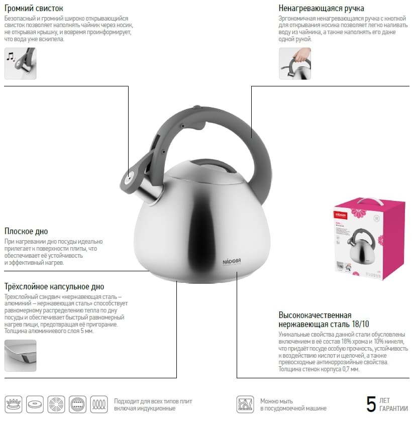 Чайник NADOBA серии Nita из высококачественной нержавеющей стали 18/10 имеет 5 лет гарантии