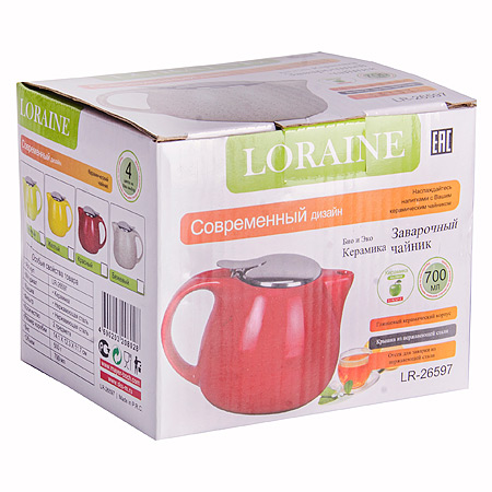 Чайник заварочный керамический 750мл LORAINE бежевый LORAINE Чайники заварочные LR Заварочный чайник выполнен из высококачественной цветной керамики. Фильтр из нержавеющей стали для заваривания раскроет букет чая и не позволит чаинкам попасть в чашку. Удобная металлическая крышка поддержит нужную температуру для заваривания чая. Керамический чайник прост и удобен в применении, чайник легко мыть. Не ставьте чайник на открытый