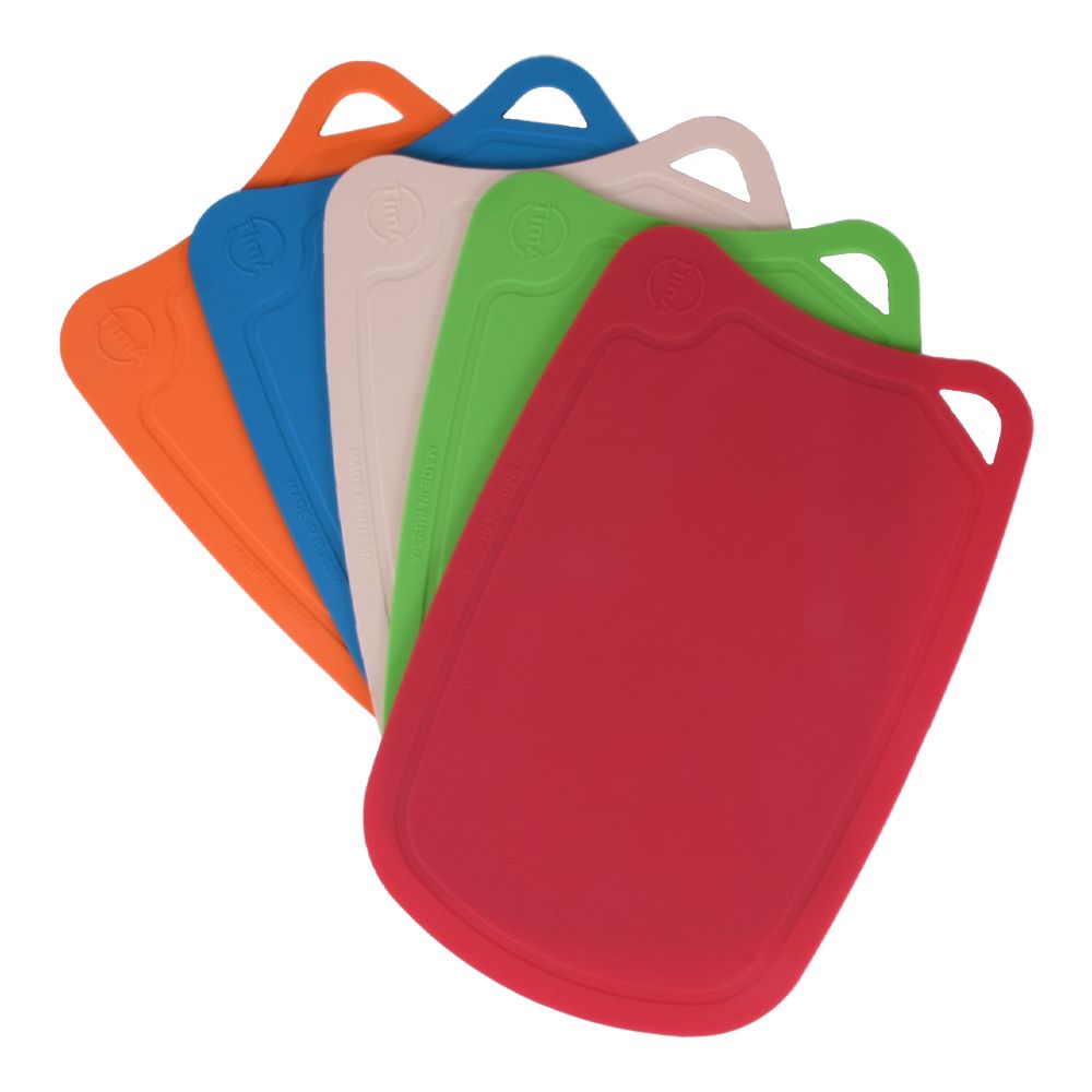 • Достоинства: Устойчива к порезам даже при сильном нажатии острого ножа, приятная на ощупь, удобные бороздки по периметру, в них стекает жидкость при нарезании сочных продуктов, ничего не проливается на стол. Гибкая фактура позволяет опускать нарезанное в любую форму посуды, даже в маленький ковшик.