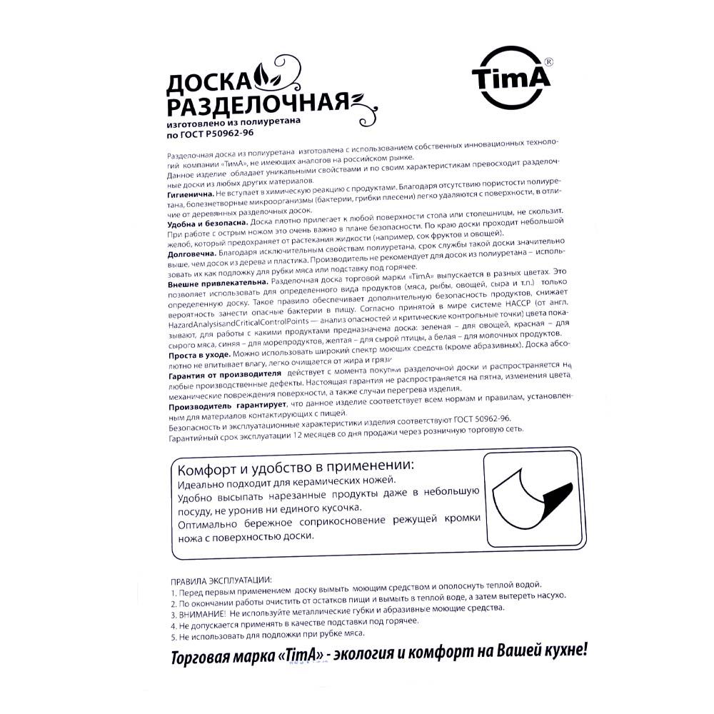 Разделочная доска из полиуретана - собственная инновационная разработка компании «TimA», не имеющая аналогов на российском рынке. Она обладает уникальными свойствами и по своим характеристикам превосходит разделочные доски из любых других материалов.