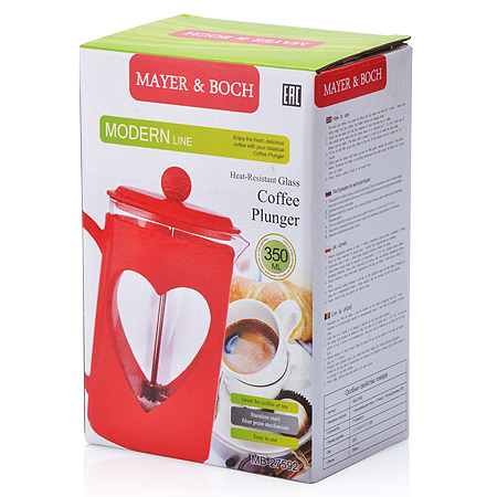 Френч-пресс 350мл MAYER & BOCH термостойкое стекло, пластик MAYER & BOCH Френч-прессы M&B Френч-пресс изготовлен из высокотехнологичных материалов на современном оборудовании. Колба из высококачественного термостойкого стекла заключена в корпус из яркого пищевого пластика. Фильтр-поршень из нержавеющей стали выполнен по технологии "press-up" для обеспечения равномерной циркуляции воды в чайнике. Удобная, не нагревающаяся ручка и крышка