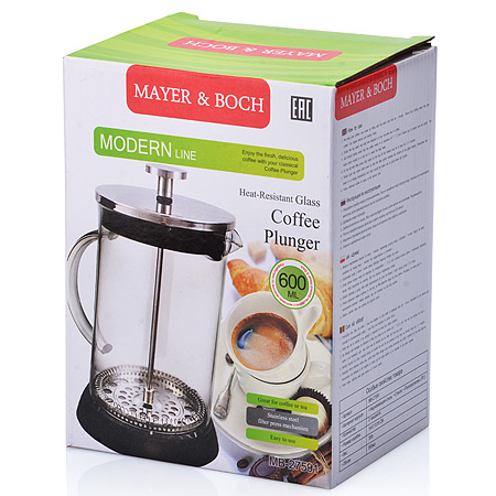 Френч-пресс изготовлен из высокотехнологичных материалов на современном оборудовании. Корпус из высококачественного боросиликатного термостойкого стекла, устойчивого к окрашиванию, царапинам и термошоку. Фильтр-поршень из нержавеющей стали выполнен по технологии "press-up" для обеспечения равномерной циркуляции воды в чайнике. Подставка из инертного силикона препятствует скольжению френч-пресса. Практичный и стильный дизайн полностью соответствует последним модным тенденциям в создании предметов бытовой техники.Френч-пресс MAYER & BOCH позволит вам быстро и без усилий приготовить свежий ароматный кофе или чай. Подходит для мытья в посудомоечной машине. Не использовать чистящие и дезинфицирующие средства, содержащие хлор. Не подходит для использования на открытом огне.