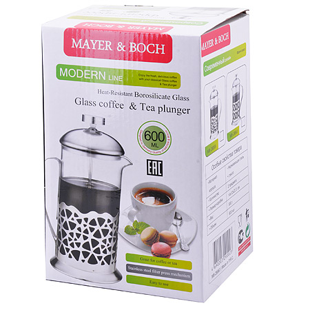 Френч-пресс изготовлен из высокотехнологичных материалов на современном оборудовании. Колба из высококачественного термостойкого боросиликатного стекла заключена в корпус из нержавеющей стали. Фильтр-поршень из нержавеющей стали выполнен по технологии "press-up" для обеспечения равномерной циркуляции воды в чайнике. Удобная, не нагревающаяся ручка также выполнена из качественной нержавеющей стали. Практичный и стильный дизайн полностью соответствует последним модным тенденциям в создании предметов бытовой техники. Френч-пресс MAYER & BOCH позволит вам быстро и без усилий приготовить свежий ароматный кофе или чай. Подходит для мытья в посудомоечной машине. Не использовать чистящие и дезинфицирующие средства, содержащие хлор. Не подходит для использования на открытом огне. Объем: 600 мл.