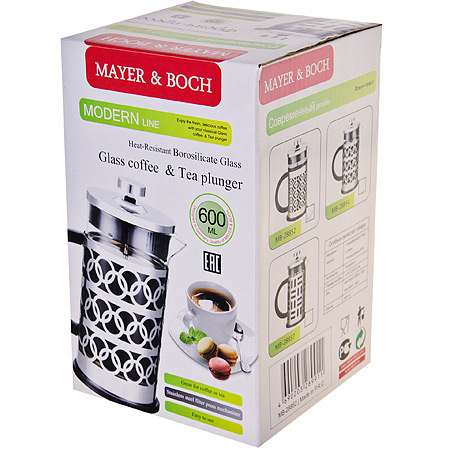 Френч-пресс изготовлен из высокотехнологичных материалов на современном оборудовании. Колба из высококачественного термостойкого боросиликатного стекла заключена в корпус из нержавеющей стали. Фильтр-поршень из нержавеющей стали выполнен по технологии "press-up" для обеспечения равномерной циркуляции воды в чайнике. Удобная, не нагревающаяся ручка также выполнена из качественной нержавеющей стали. Практичный и стильный дизайн полностью соответствует последним модным тенденциям в создании предметов бытовой техники. Френч-пресс MAYER & BOCH позволит вам быстро и без усилий приготовить свежий ароматный кофе или чай. Подходит для мытья в посудомоечной машине. Не использовать чистящие и дезинфицирующие средства, содержащие хлор. Не подходит для использования на открытом огне.