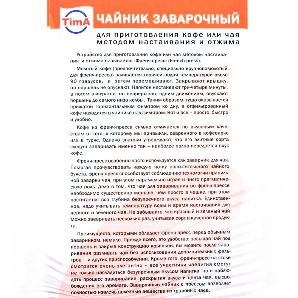 Френч-пресс ТИМА - это устройство для приготовления кофе или чая методом настаивания и отжима. Поршень френч-пресса оснащен специальной сеткой-фильтром, которая препятствует попаданию листьев чая и зёрен кофе в напиток. Френч-пресс идеально подходит для заваривания листового чая и зернового кофе, мелкого и среднего помола.