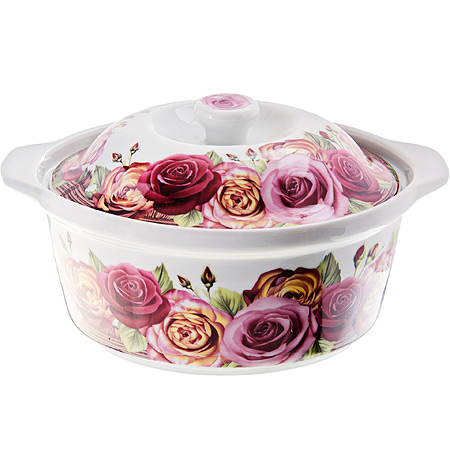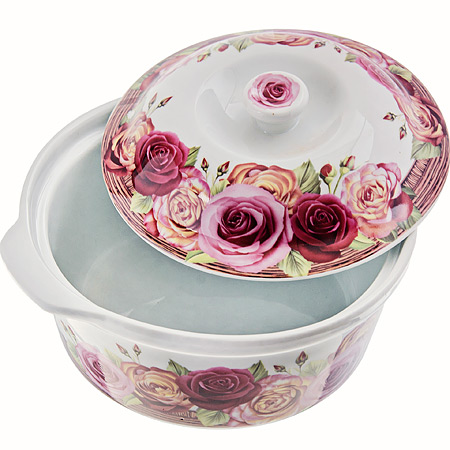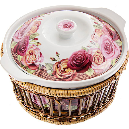 Кастрюля имеет классическую круглую форму и небольшие удобные ручки. Поверхность украшена изображением цветов. В комплект также входит плетеная корзинка из ротанга, выполняющая роль оригинальной подставки для кастрюли. Фарфоровая кастрюля прекрасно подойдет для запекания овощей, мяса и других блюд, а благодаря своему оригинальному дизайну, она, несомненно, украсит ваш стол. Посуда не впитывает посторонние запахи, не имеет труднодоступных выступов или изгибов, которые накапливают грязь, и легко чистится. Фарфор выдерживает высокие перепады температуры, поэтому такую кастрюлю можно использовать в духовке, микроволновой печи, а также для хранения пищи в холодильнике. Подходит для мытья в посудомоечной машине. В комплекте: кастрюля, крышка, плетеная корзинка.