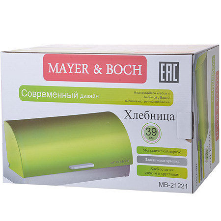 Классическая хлебница MAYER& BOСH, изготовленная из нержавеющей стали и пластика, поможет надолго сохранить Ваш хлеб свежим. Изделие снабжено удобной пластиковой крышкой, которая имеет надежный механизм и не занимает дополнительного места для открытия, легко и бесшумно открывается и закрывается. Хлебница имеет компактные размеры, поэтому не займет много места на Вашей кухне. Яркий дизайн, эстетичность и функциональность сделают хлебницу MAYER& BOСH превосходным аксессуаром на Вашей кухне. Размер: 39 х 27,5 х 18,5 см. Вес в упаковке: 1,73 кг.
