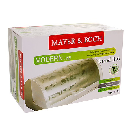 Хлебница MAYER & BOCH позволит надолго сохранить свежесть, мягкость, аромат хлеба и других хлебобулочных изделий. Хлебница выполнена в классическом дизайне из нержавеющей стали и полупрозрачного пластика с красивым узором. Сталь не окисляется, не ржавеет и не вступает в реакцию с пищевыми продуктами — это прочный и неприхотливый в уходе материал.