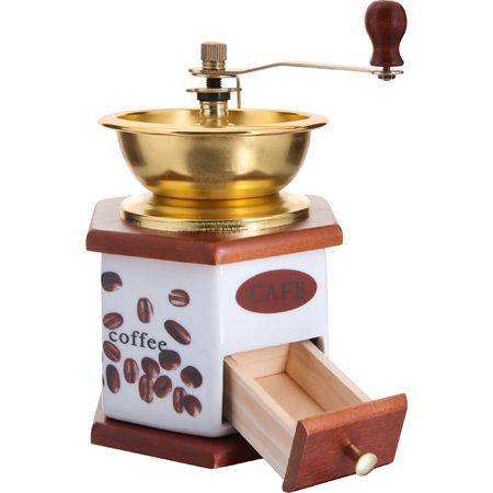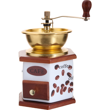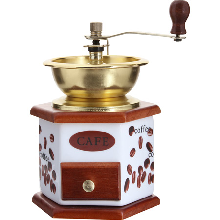 Ручная жерновая кофемолка MAYER & BOCH с воронкой открытого типа. Металлическая воронка выполнена под черненый металл, придавая кофемолке старинный, винтажный вид. Корпус кофемолки с выдвижным ящичком для молотого кофе выполнен из дерева и керамики. Механизм кофемолки изготовлен из нержавеющей стали и отличается прекрасными эксплуатационными свойствами. Ручная кофемолка станет идеальным приобретением для тех, кто ценит аромат и вкус свежемолотого кофе. Оригинальный дизайн данной ручной кофемолки, сочетающий в себе дерево, керамику и металл, позволит ей вписаться в любой интерьер и стать настоящим украшением кухни.