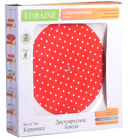 Красочная конфетница LORAINE, выполненная из высококачественной керамики, сочетает в себе классический дизайн с максимальной функциональностью. Конфетница состоит из 2-х ярусов разного размера и предназначена для красивой сервировки конфет, фруктов и десертов. Круглые ярусы конфетницы имеют волнистые края и оформлены в красно-белых тонах с белым