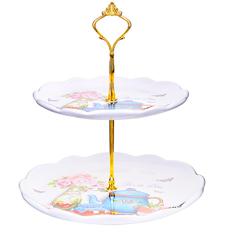 Красочная конфетница LORAINE, выполненная из высококачественной керамики, сочетает в себе классический дизайн с максимальной функциональностью. Конфетница состоит из 2-х ярусов разного размера и предназначена для красивой сервировки конфет, фруктов и десертов. Круглые ярусы конфетницы имеют волнистые края. Стойка-держатель конфетницы выполнена из металла с золотым напылением. Высота конфетницы в собранном виде составляет около 28 см. Элегантная конфетница LORAINE украсит сервировку Вашего стола и подчеркнет прекрасный вкус хозяйки, а также станет отличным подарком. Изделие упаковано в индивидуальную коробку. Подходит для использования в холодильнике, посудомоечной машине. D нижнего яруса: 24 см. D верхнего яруса: 20 см.