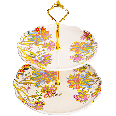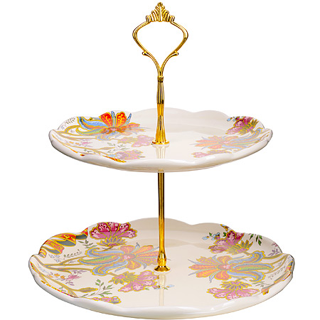 Красочная конфетница LORAINE, выполненная из высококачественной доломитовой керамики, сочетает в себе классический дизайн с максимальной функциональностью. Конфетница состоит из 2-х ярусов разного размера и предназначена для красивой сервировки конфет, фруктов и десертов. Круглые ярусы конфетницы имеют волнистые края. Стойка-держатель конфетницы выполнена из металла с золотым напылением. Высота конфетницы в собранном виде составляет около 28 см. Элегантная конфетница LORAINE украсит сервировку Вашего стола и подчеркнет прекрасный вкус хозяйки, а также станет отличным подарком. Изделие упаковано в индивидуальную коробку. Подходит для использования в холодильнике, посудомоечной машине. D нижнего яруса: 24 см. D верхнего яруса: 20 см.