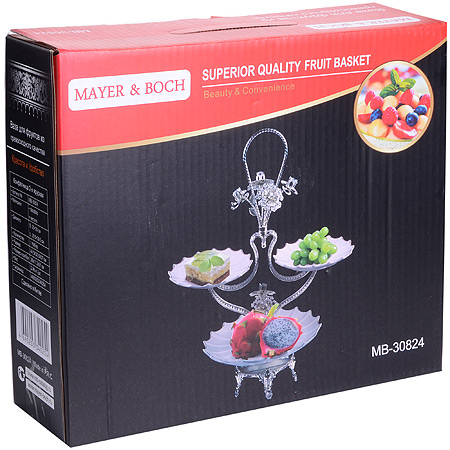 Элегантная конфетница MAYER & BOCH выполнена из фарфора. Конфетница состоит из 2-х ярусов разного размера и предназначена для красивой сервировки конфет, фруктов и десертов. Фарфоровые ярусы конфетницы оформлены серебряной каймой. Стойка-держатель конфетницы выполнена из металла с серебряным покрытием. Конфетница украсит сервировку вашего стола и