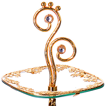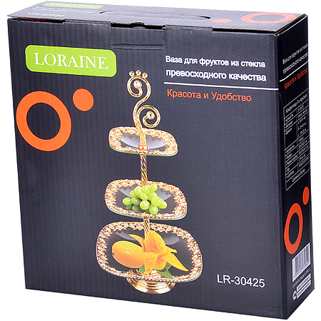 Элегантная конфетница LORAINE, выполненная из стекла, сочетает в себе изысканный дизайн с максимальной функциональностью. Конфетница состоит из 3-х ярусов разного размера и предназначена для красивой сервировки конфет, фруктов и десертов. Ярусы конфетницы оформлены оригинальным золотым орнаментом. Стойка-держатель конфетницы выполнена из стали с золотым покрытием. Конфетница украсит сервировку вашего стола и подчеркнет прекрасный вкус хозяина, а также станет отличным подарком.