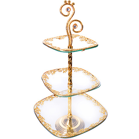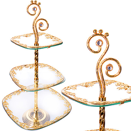Элегантная конфетница LORAINE, выполненная из стекла, сочетает в себе изысканный дизайн с максимальной функциональностью. Конфетница состоит из 3-х ярусов разного размера и предназначена для красивой сервировки конфет, фруктов и десертов. Ярусы конфетницы оформлены оригинальным золотым орнаментом. Стойка-держатель конфетницы выполнена из стали с