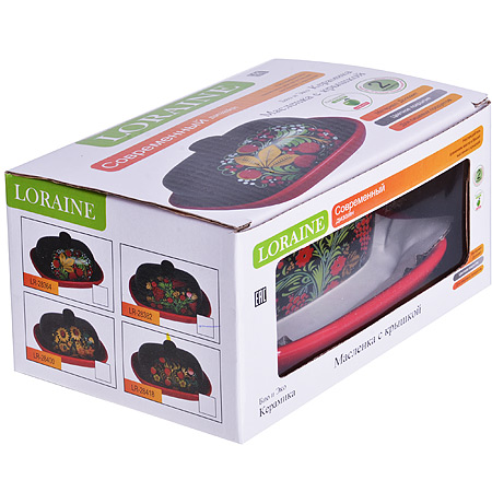 Масленка LORAINE, выполненная из качественной доломитовой керамики и декорированная ярким рисунком, станет украшением интерьера вашей кухни. Масленка надежно закрывается керамической крышкой и прекрасно подойдет для хранения и сервировки масла, сыра, творога. Масленка рассчитана примерно на 200 г. масла. Пригодна для использования в холодильнике, морозильнике, микроволновой печи. Подходит для мытья в посудомоечной машине.
