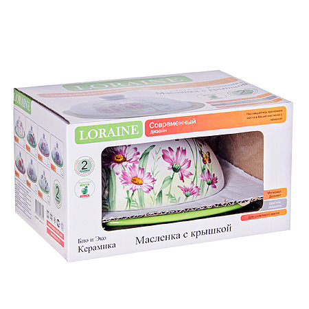 Масленка LORAINE Цветы доломит, овальная LORAINE Масленки LR Масленка LORAINE овальной формы, выполненная из качественной доломитовой керамики, станет украшением интерьера вашей кухни. Масленка надежно закрывается керамической крышкой и прекрасно подойдет для хранения и сервировки масла, сыра, творога. Масленка рассчитана примерно на 200 г. масла. Пригодна для использования в холодильнике, морозильнике,