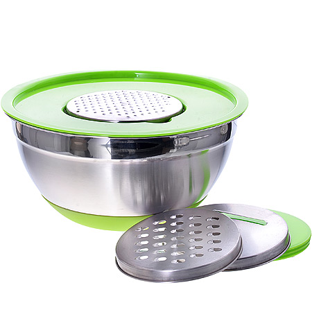 Универсальная миска с крышкой и 3-мя терками, объемом 3,2 литра, станет настоящей помощницей на кухне. Подходит для взбивания миксером и венчиком через отверстие в крышке, а также для шинковки продуктов прямо в миску. Материал миски и терок нержавеющая сталь, крышка выполнена из пластика.Терки: мелкая, крупная, шинковка. На дне миски силикон, что