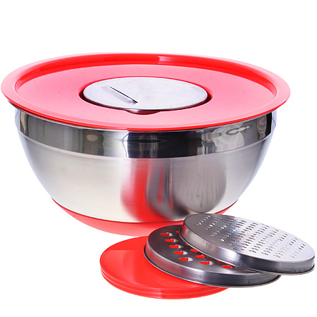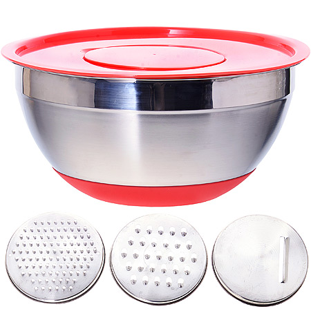 Универсальная миска с крышкой и 3-мя терками, объемом 4 литра, станет настоящей помощницей на кухне. Подходит для взбивания миксером и венчиком через отверстие в крышке, а также для шинковки продуктов прямо в миску. Материал миски и терок нержавеющая сталь, крышка выполнена из пластика.Терки: мелкая, крупная, шинковка. На дне миски силикон, что обеспечивает устойчивость миски на поверхности. При взбивании миксером крышка не даст брызгам разлететься во все стороны.