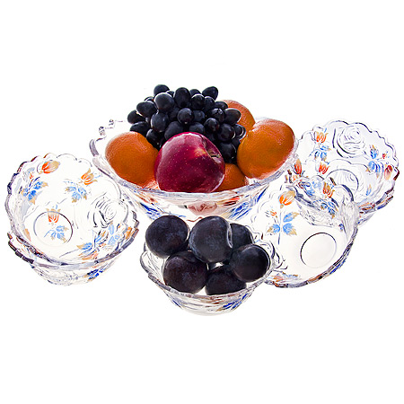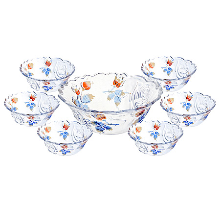 Набор из 7-ми салатниц выполнен из высококачественного стекла и декорирован цветочным рисунком. Изящные салатницы станут прекрасным дополнением к набору посуды и внесут яркий акцент в сервировку как повседневного, так и праздничного стола, а также будут прекрасным подарком. Посуда обладает непористой поверхностью и не впитывает запахи, легко и быстро моется. В комплекте: 1 большая салатница, 6 маленьких пиал. 1 салатница: D 22 см. 6 пиал: D 11,5 см.