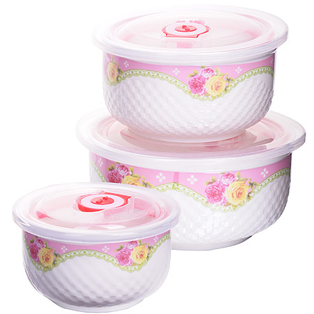 Набор салатниц с крышками LORAINE выполнен из керамики. Гибкая крышка сделана из пластика. Набор состоит из 3-х салатниц разного размера. Изделия декорированы орнаментом и рисунком, сочетая в себе классический дизайн с максимальной функциональностью. Удобная крышка из пищевого пластика позволит дольше храниться приготовленным блюдам. Такой набор послужит отличным подарком к любому празднику, а также добавит элегантности и уюта любому праздничному столу! Посуда обладает гладкой непористой поверхностью, не впитывает запахи, легко моется. Подходит для мытья в посудомоечной машине.