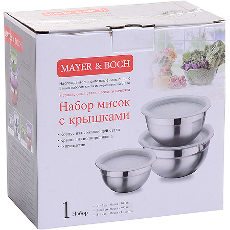 Миски нержавеющие MAYER & BOCH — просто незаменимая вещь на кухне любой современной хозяйки. С ней приготовление и употребление пищи переходит на качественно новый уровень. Приятно готовить, легко мыть! Миска изготовлена из нержавеющей стали самого высокого качества, соответствующей международным стандартам. Она применяется для приготовления салатов, смешивания (взбивания) различных ингредиентов, мытья овощей и фруктов, а также для хранения продуктов в холодильнике и замораживания в морозильной камере.
