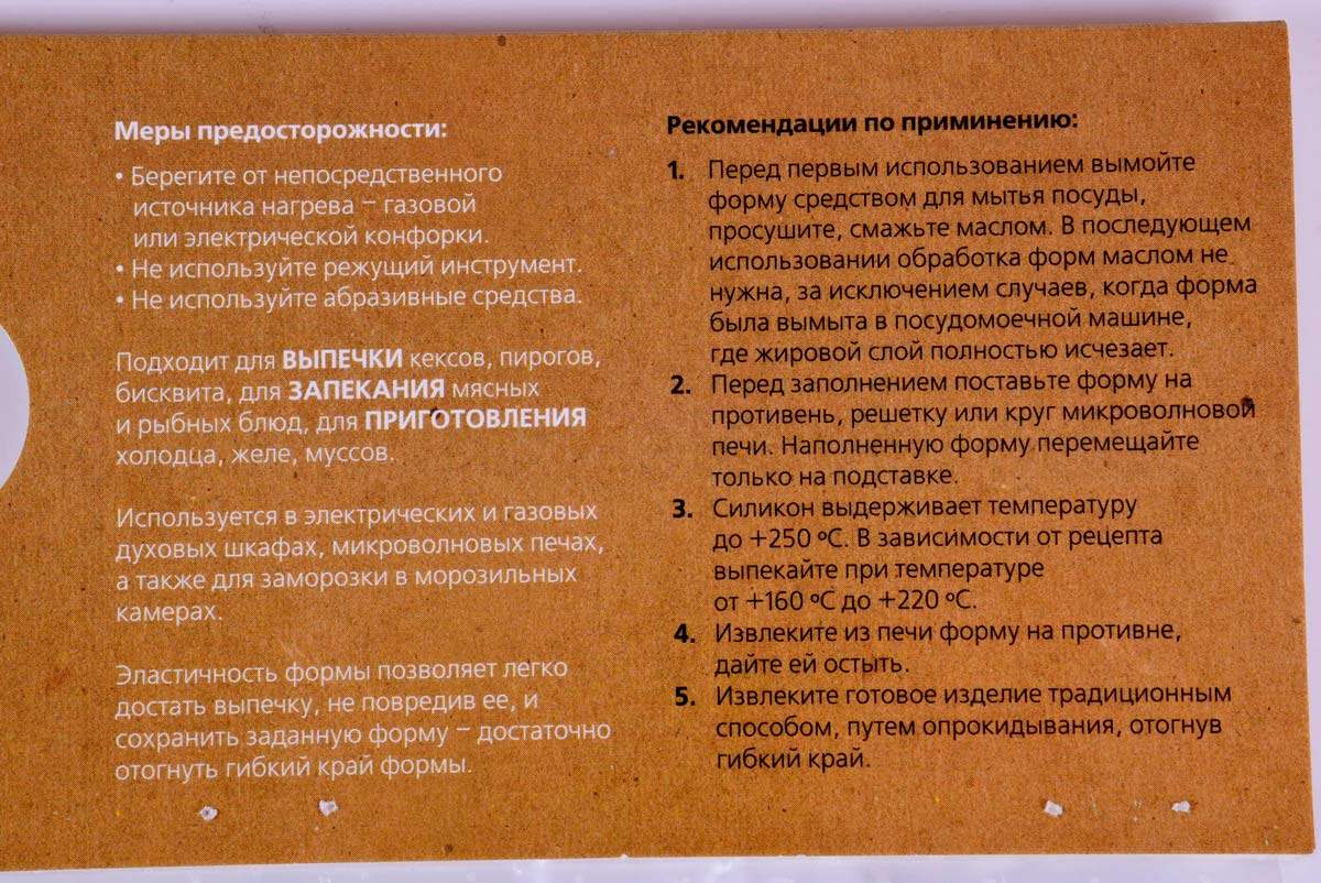 Силикон обладает естественными антипригарными свойствами, поэтому нет необходимости смазывать формы маслом. Перед использованием достаточно сбрызнуть водой. И в отличии от металлической посуды, силикон не взаимодействует с продуктами и оставляет естественный вкус продуктов.