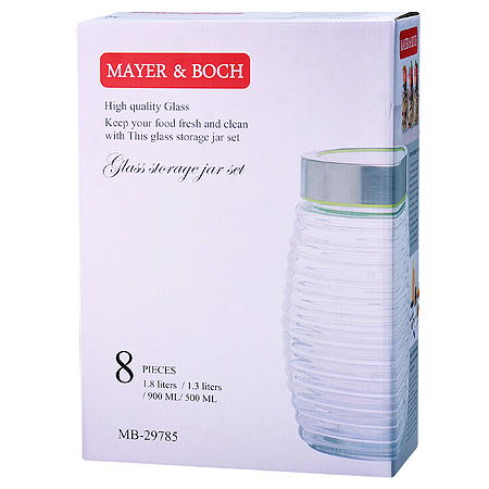 Набор MAYER & BOCH из 4-х банок для сыпучих продуктов выполнен из высококачественного стекла. Банки предназначены для хранения различных сыпучих продуктов: сахара, кофе, муки, соли, круп, макаронных изделий и т. п. Крышки плотно закрываются и препятствуют проникновению влаги и посторонних запахов внутрь. Стильный, необычный и оригинально